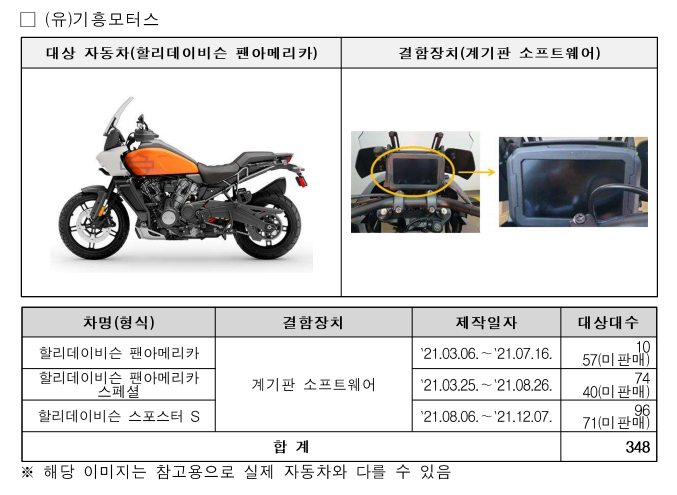 마지막으로, (유)기흥모터스㈜에서 수입, 판매한 할리데이비슨 팬아메리카 등 3개 이륜 차종 348대(판매이전 포함)는 계기판 소프트웨어 오류로 영하의 온도에서 시동을 걸 경우 계기판 화면이 보이지 않는 안전기준 부적합 사항이 확인되어 우선 수입사에서 자발적으로 시정조치(리콜)를 진행하고, 추후 시정률 등을 감안하여 과징금을 부과할 계획이다.