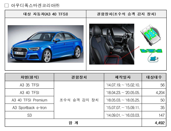 둘째, 아우디폭스바겐코리아㈜에서 수입, 판매한 A3 40 TFSI 등 5개 차종 4,492대는 조수석 승객 감지 장치 배선 연결부의 접촉 불량으로 사고 발생 시 에어백이 전개되지 않아 탑승자가 상해를 입을 가능성이 확인되어 자발적으로 시정조치(리콜)에 들어간다.