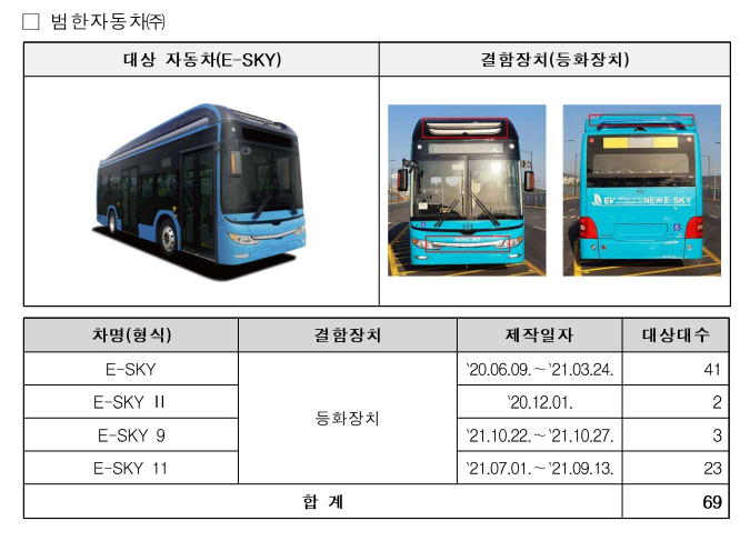 셋째, 범한자동차㈜에서 수입, 판매한 E-SKY 버스 등 4개 차종 69대는 차량 전·후면에 자동차 안전기준에서 정하고 있지 않은 등화장치를 설치한 것이 확인되어 우선 수입사에서 자발적으로 시정조치(리콜)를 진행하고, 추후 시정률 등을 감안하여 과징금을 부과할 계획이다.