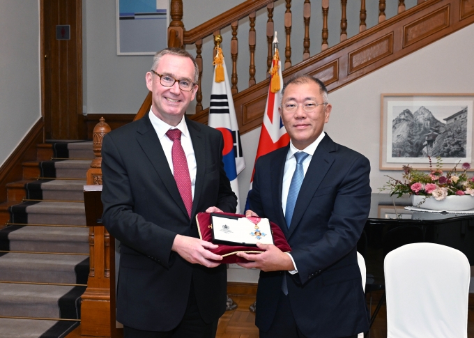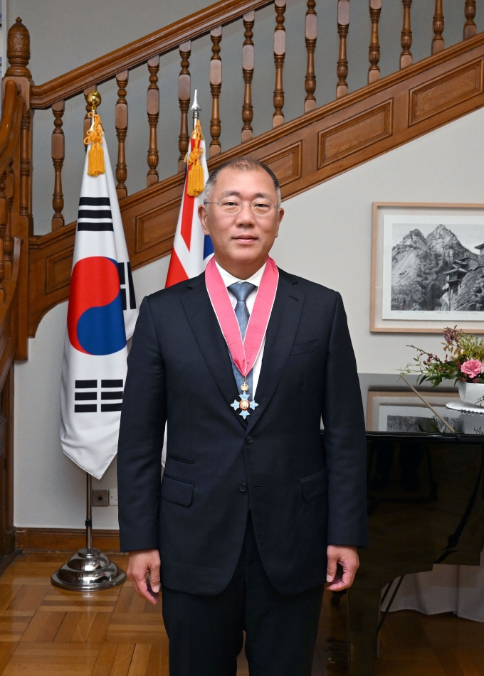 현대차그룹은 14일 서울 중구 주한 영국 대사관에서 열린 대영제국훈장 수훈식에서 정의선 회장이 「대영제국 지휘관 훈장(Honorary Commander of the Most Excellent Order of the British Empire, CBE)」을 수훈했다고 밝혔다.