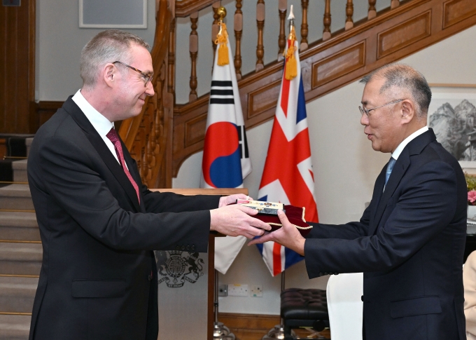 영국 찰스 3세 국왕을 대신해 콜린 크룩스(Colin Crooks) 주한 영국 대사가 정의선 회장에게 훈장을 전달했다.