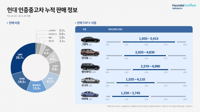 현대자동차 인증중고차 중에서 가장 많이 팔린 모델은 그랜저이고 제네시스 인증중고차 중에서는 G80가 최다 판매 모델인 것으로 집계됐다. 판매 가격대는 1000만 원대부터 시작해 1억 원이 넘는 매물도 있는 등 다양한 차량을 보유 중인 것으로 나타났다.